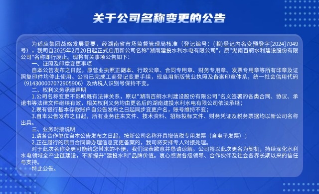 2022年9月,原湖南建工集團(tuán)與原湖南交水建集團(tuán)合并組建湖南建設(shè)投資集團(tuán)。原雙方集團(tuán)旗下的湖南百舸水利建設(shè)股份有限公司和湖南建工集團(tuán)水利水電工程公司合并為湖南建投百舸水利公司,實行兩塊牌子(百舸水利、建工水利)管理,為湖南建投集團(tuán)唯一水利建設(shè)企業(yè)。2024年9月,公司正式更名為湖南建投水利水電有限公司(簡稱湖南建投水利),統(tǒng)籌管理“百舸水利”“建工水利”“施工公司”“疏浚公司”等子品牌。